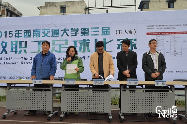 体育工作部和教职工足球协会共同承办,共有来自21个工会的27支队伍参赛。7日下午6点10分开幕式隆重举行,校工会郑江副主席在开幕式上致辞,她从国家和学校层面分别说明了举办教职工足球赛的意义,并预祝比赛取得圆满成功。