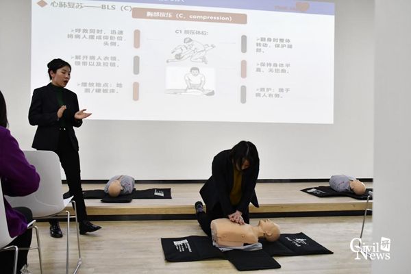 由来自成都市第二人民医院急诊科的谢妍霞、江雯、黄丹、李谨四位医生给在场教职工带来急救知识的普及,包括心肺复苏、海姆利克法等急救方法。