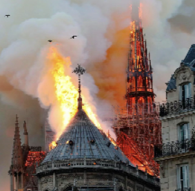 火光烈焰,浓烟弥漫,一场悲剧降临。初时弱如烛光,渐渐蔓延,火光透过彩色的窗户,将曾经宁静神秘的内里照耀得犹如地狱。古老的石柱在悲鸣,双塔的轮廓在火光中扭曲,天空染上一层灰蒙,烈火吞噬着历史的一页一页,岁月的见证在这火海中逝去。教堂的钟声在烟雾中显得更加悲切,似乎是对失落与毁灭的哀嚎。大火也许可以烧去它的一部分,但烧不去它千年沉淀,因燃烧变色的石墙、崩塌的房梁,给它蒙上了一层破碎感,它美得放肆却让人心生怜惜。