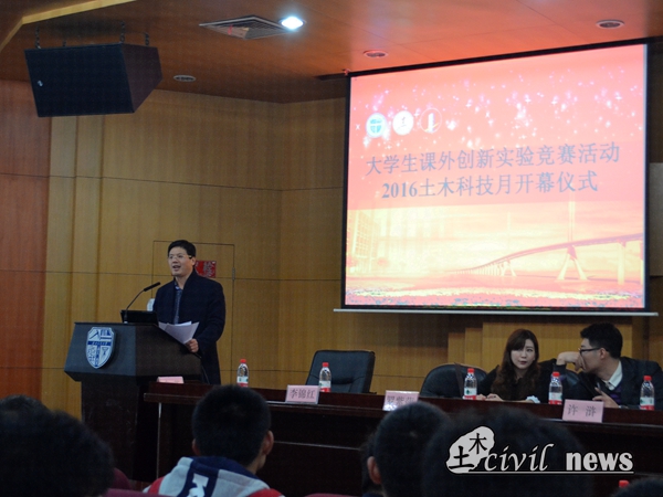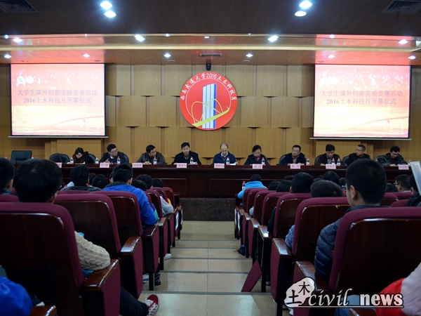 一片热烈的掌声中,2016土木科技月各项赛事负责老师及学院相关领导分别就坐。接着李锦红副书记通过一段视频,为在场所有人展示了去年土木科技月的点点滴滴,展示了参赛选手的努力与团体间的配合。在看完视频后,李锦红副书记喊出了本次比赛的口号“办一流科技比赛,育万千创新英才”。