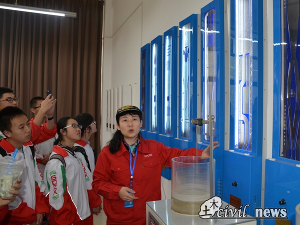 中午稍作休息后,同学们起身来到了四号教学楼,参观流体力学实验室。在进门之后就大家听到一阵水声,走上前一看,水槽里的水哗哗地流动着。据介绍,这个长约4米的水槽叫做“FSY-型非均匀流水面线演示仪”,可以用来模拟河床,通过改变控制方式还能够模拟水浪。当一个水浪真正的从一头奔向另一头的时候,大家都惊讶了。紧接着是一连串的实验仪器,包括雷诺实验仪、相对平衡实验仪、自循环流动演示仪等等。自循环流动演示仪可以通过调节来改变流动快慢,实验室老师也为大家解释了装置的原理。面对着新鲜的事物,同学们一直保持着好奇,认真地听着并且时不时做着记录。到另外一个房间后,同学们饶有兴致地观看了电化学法流谱流线显示仪、测压管水头线演示仪、文丘里流量计实验仪等仪器的演示实验。