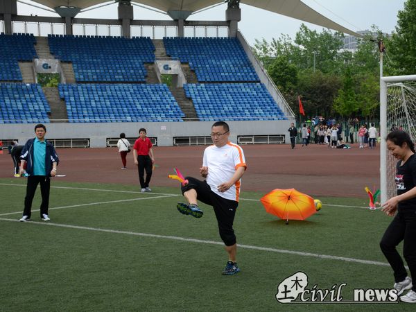 上午的比赛异常激烈,师生们热情高涨,在各种项目前跃跃欲试。最先开始的项目是得意门生,每个学院派出四个男老师和一个女老师参加比赛,老师们早早地换好了衣服围在球门前,在熟悉了比赛规则后比赛便正式开始,男老师们站在罚球区弧线后,将等距离放置在弧线上的五个球用力踢入球门中,女老师们则站在靠前的位置讲球直射入球门。性吧