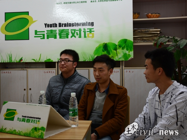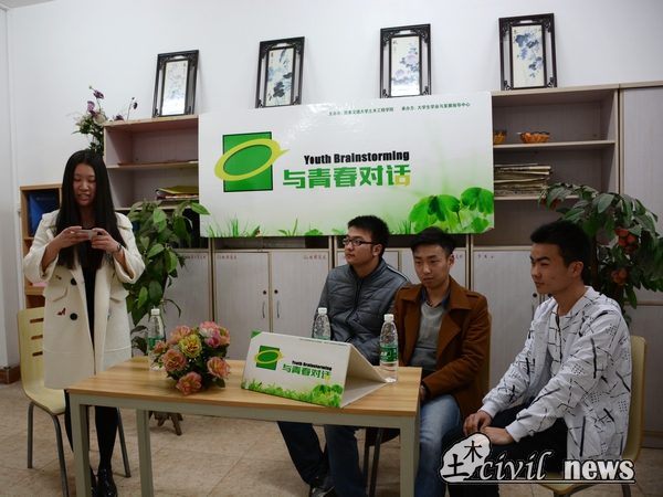 主办、大学生学业与发展指导中心承办的访谈类节目《与青春对话》于三号党建活动室举行。此次节目的主持人为2015级土木16班的魏云格同学,接受采访的三位学长分别是来自2014级土木10班的贾文涛、邵晨超同学以及15班的吴强亮同学。