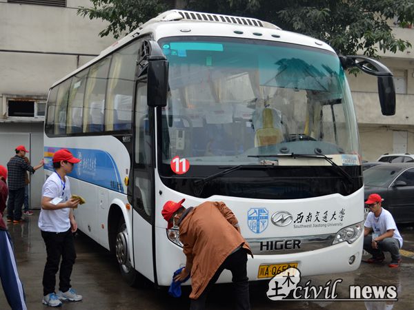 结束了早上繁忙的课程,下午两点,志愿者们就准时在犀浦校区校车站集合。大家提前准备好了抹布、水桶、拖把和脸盆等清洗工具。清点人数过后,大家带上象征土木青年志愿者协会的红帽子乘坐校车抵达九里校区校车站。