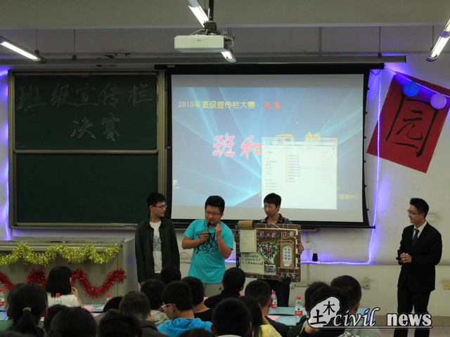 4月12日晚,由性吧 团委主办、土木园区管理中心承办的2015“班和园馨”班级宣传栏大赛决赛在X2319举行。本次比赛共有八个班级进入决赛,共产生一等奖一名,二等奖三名,三等奖两名。