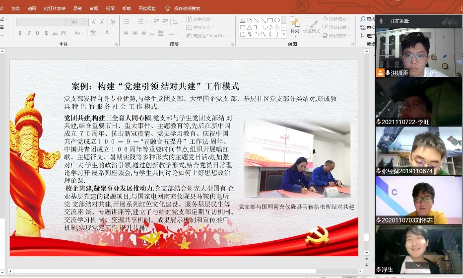 在支部书记简洁的自我介绍之后,第七党支部全体成员开启摄像头,来了一次别开生面的线上见面会。同学们朝气蓬勃,斗志昂扬,完美展现了新时代青年的生机活力。
