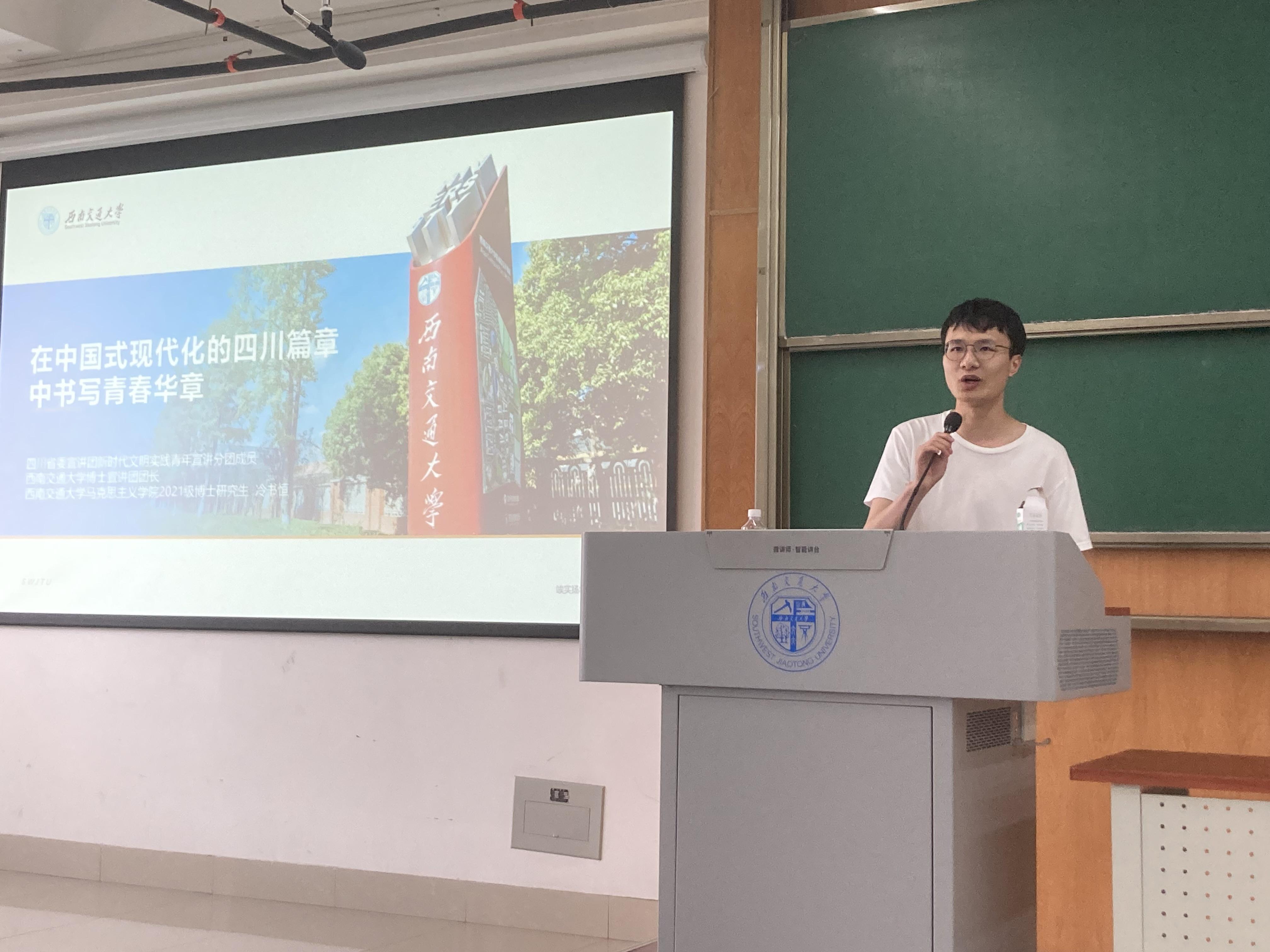 第十二届红土党课大讲堂(三)。我校博士宣讲团成员——马克思主义学院冷书恒博士发表了“在中国式现代化的四川篇章中书写青春华章”为主题的宣讲。