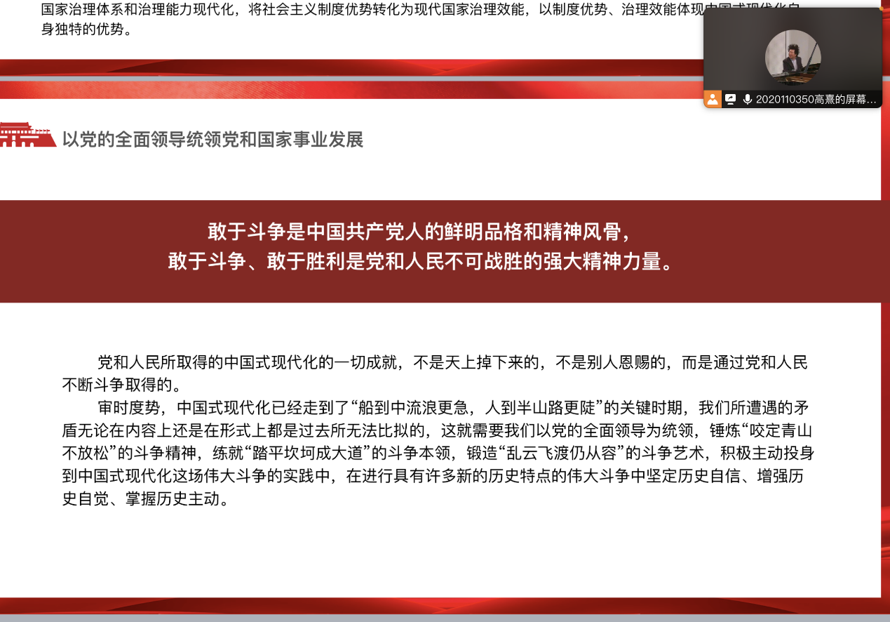 本次党课教育学习活动中,高熹从中国式现代化的五个特色讲起,谈到了中国式现代化的本质要求,强调了中国式现代化的最本质要求是中国共产党的领导。同时,中国式现代化离不开每一位中国青年,需要每一位中国青年作出自己的贡献,党员同志要做到自觉遵守支部的组织纪律,积极做事,凝心聚力,提高理论学习,积极贯彻落实二十大精神。