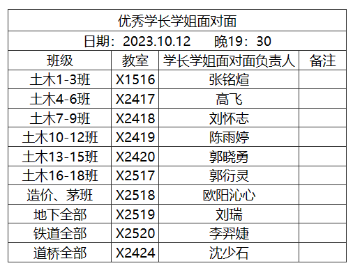 为搭建朋辈交流平台,进一步学习先进典型人物标杆,提高学院学风建设水平。土木学院大学生学业与发展指导中心将于2023.10.12日晚19:30在新生年级范围内开展优秀学长学姐面对面活动。参与本次活动的学长学姐均为荣获2022年度十大优秀本科生荣誉称号的学生。学长学姐将通过围绕自身的学习经验、竞赛经验、学生工作经验以及科研经验开展本次面对面活动。希望2023级土木新生能够认真聆听并感悟优秀学生个人成长经验,构建属于自己的美好并且丰富的大学生活。活动教室以及分配班级如下所示: