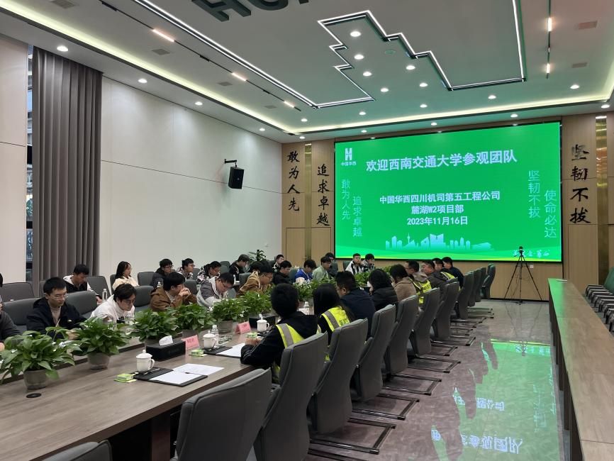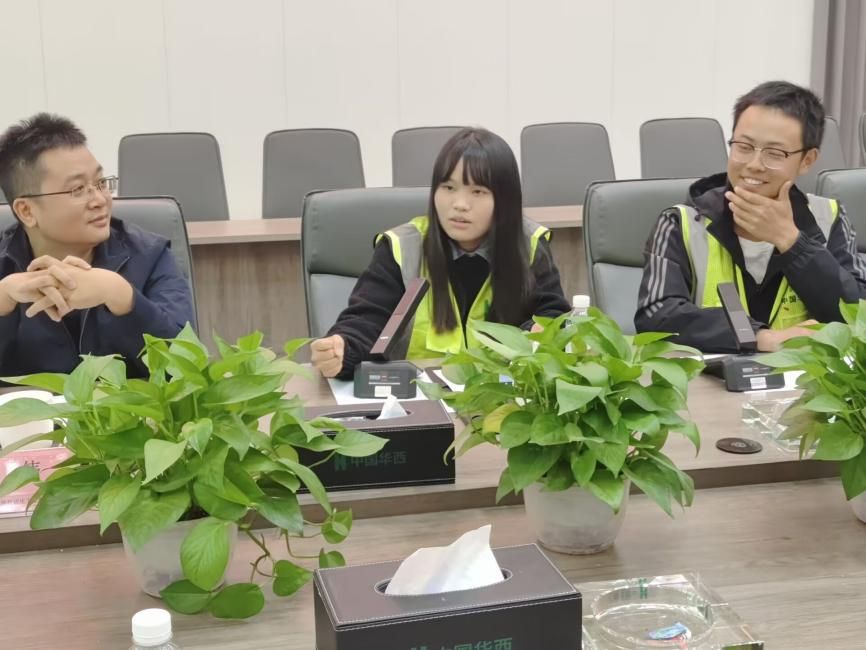 项目现场参观结束后,学院师生返回麓湖生态城C28项目部会议室进行座谈交流。项目负责人从中国华西四川机司公司宣传片、形象片入手,让同学们认识企业、了解企业,依托麓湖生态城C28项目情况及关键节点,让同学们更加深入了解了项目实际施工中的重点难点。此外,还特别邀请到了项目部2023年新员工及我校校友给同学们分享了入职以来的心得体会,在与同学们的交流讨论中,解答了同学们心中的疑惑。