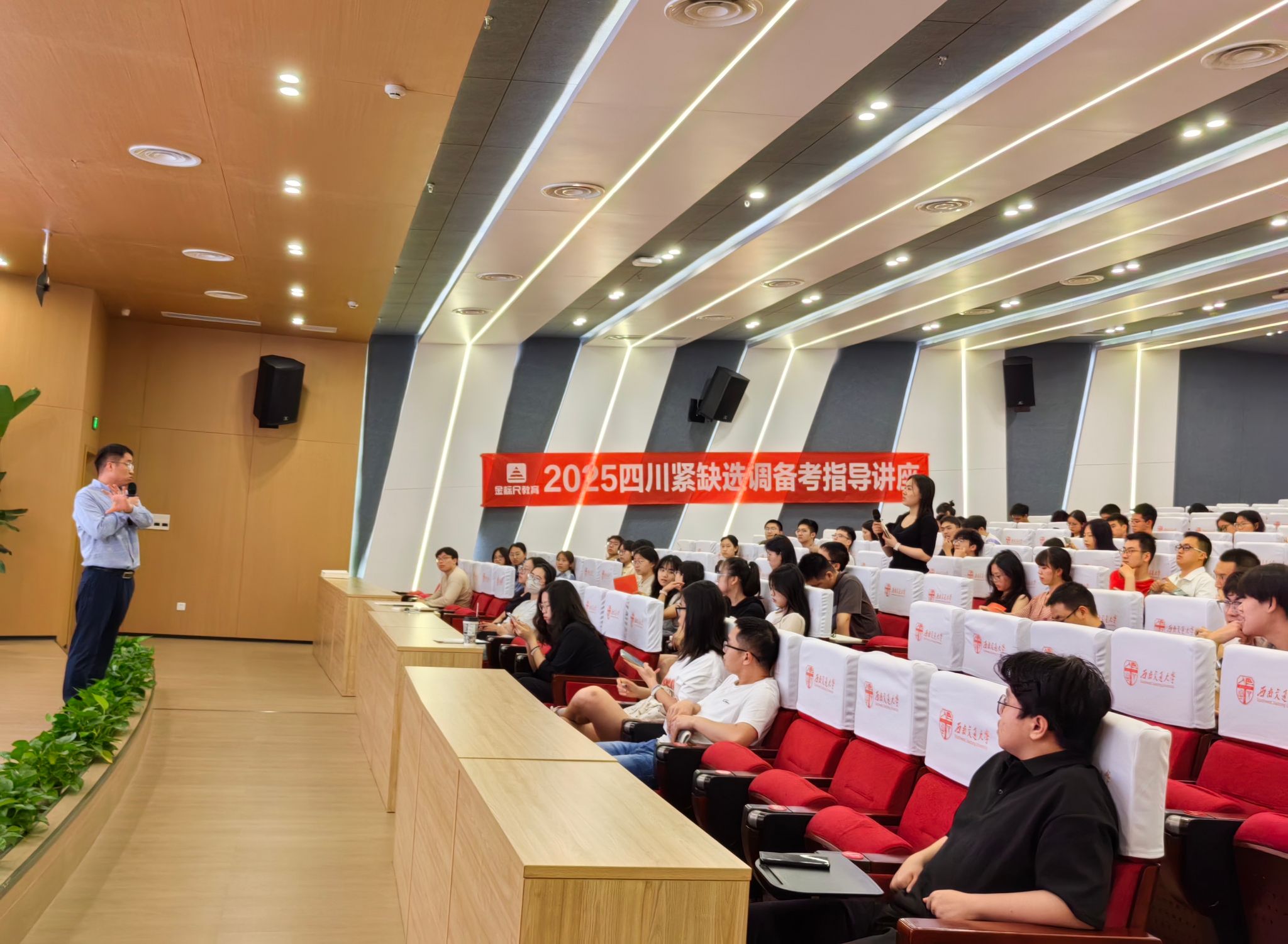 与考公与基层实训工作室联合承办了2025四川紧缺选调备考指导讲座。本次讲座于2024年5月16日晚19:00在图书馆一楼一号报告厅如期举行,主讲嘉宾为金标尺资深名师高中。