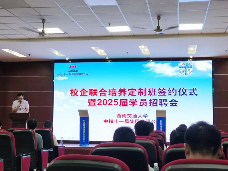 联合中铁十一局集团有限公司举办了校企联合培养定制班签约仪式暨2025届学员招聘会,全校各学院共100余名同学参加。