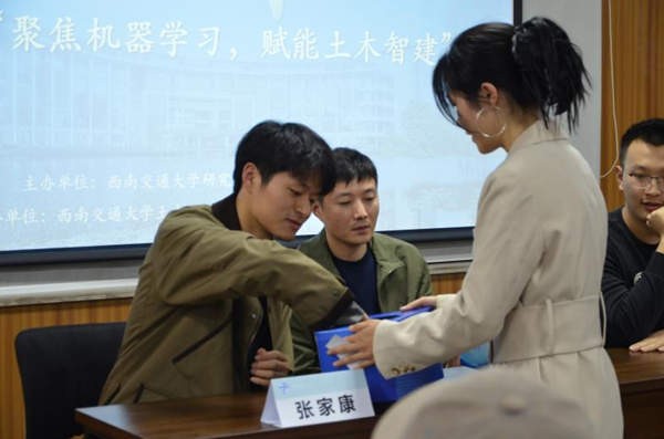 问答环节结束后,活动进入了激动人心的抽奖环节。工作人员负责收集参与问答环节的同学号码牌,由张教授随机抽取一名幸运观众并颁发了活动精品奖——《机器学习》(西瓜书)。此外,张博士和徐博士共同抽取了两名观众,分别颁发了活动纪念品——文创笔记本。