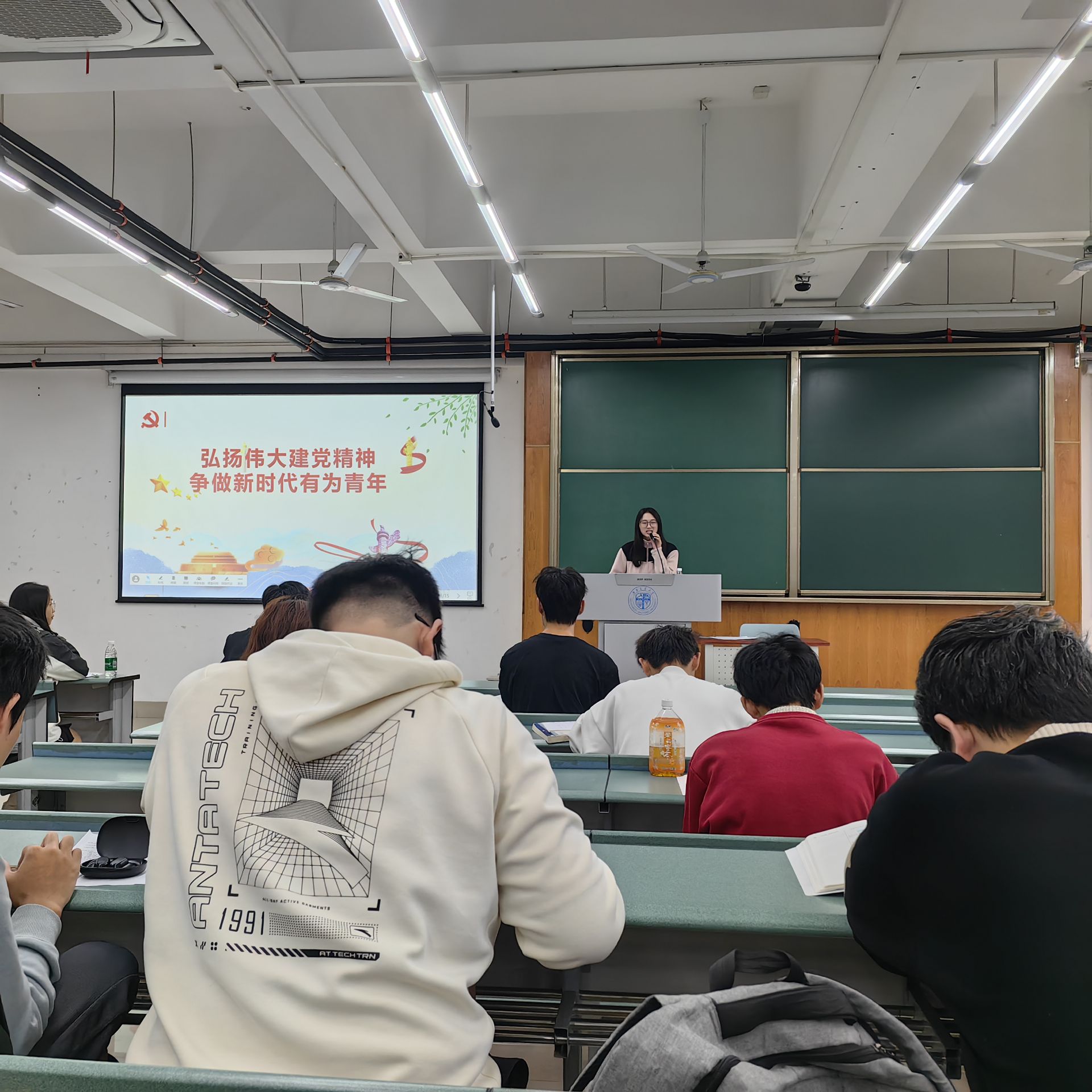 罗老师以中国共产党的辉煌历程为线索,巧妙地运用党的历史发展脉络,勾勒出伟大建党精神的逐步发展过程,并结合先辈们的英雄事迹与经典名言,为在场同学呈现了一场思想深邃、情感丰富的视听盛宴。
