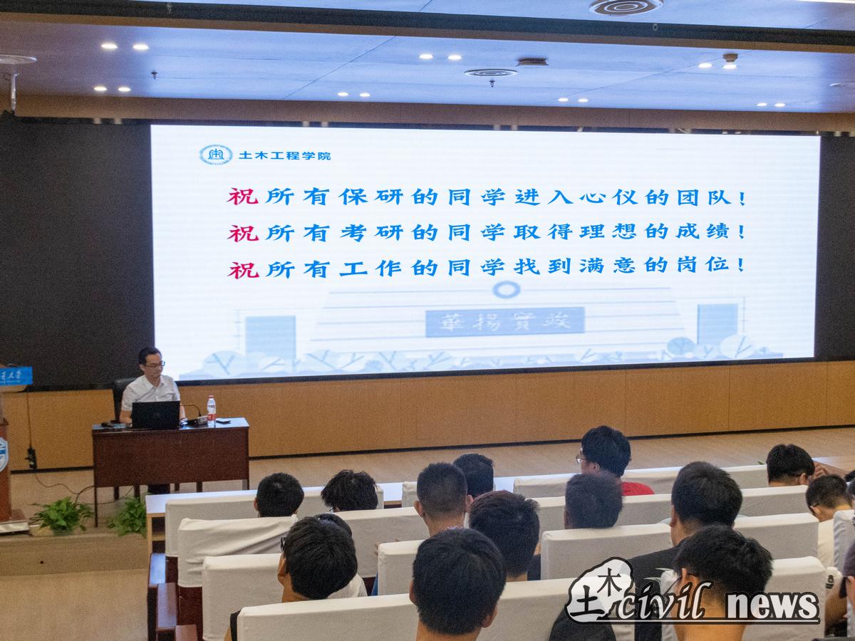 党委副书记周曦详细阐述了应届生毕业将面临哪些具体选择,介绍了就业、保研、考研等方面的详细调研数据。他指出,不论学生选择就业创业还是选择升学深造,学校和学院始终会为学生提供支撑、保驾护航。同时他指出,学生做出未来人生规划的选择之后就要坚定不移地为之努力。此外,周曦副书记还介绍了考研方面相关注意事项。