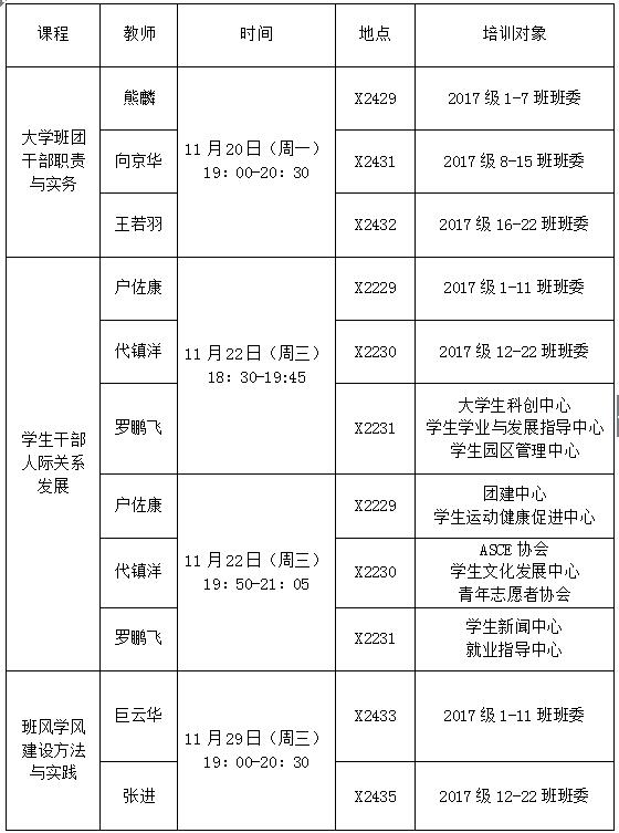 2017-2018学年“新阶梯成才”学生干部培训初级班将于11月20日正式开始培训。以下是本次培训的课程安排。