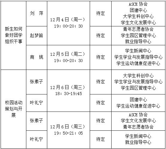 请已报名的班团干部、团学组织干事按照以上课程表准时到达指定教室上课,请一定要携带有效证件(一卡通),将有工作人员现场收取一卡通进行考勤(下课后归还),不得无故缺席。所有参加培训的班干将会组织参加工作研讨会,具体时间地点待定,由工作人员另行通知;请每位参加校园活动策划与开展的组织干事在课程结束一周内上交一份策划,以组织为单位发送至团建中心工作人员邮箱。