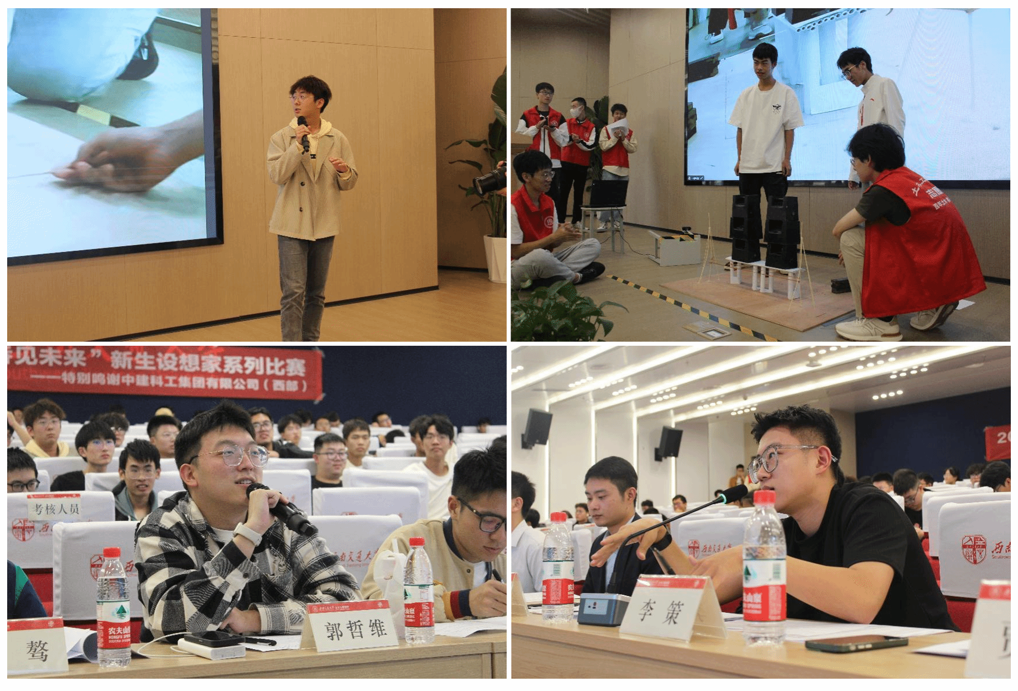 “桥见未来”新生赛决赛在我校犀浦校区图书馆二号报告厅举行。中建科工四川公司天科创智项目总工程师张炳宏,中建科工集团四川公司人力资源管理部人力专员姚军,学院辅导员老师李江怀,薛人铭,谢宇清,贾璇琦,李策,郭哲维,李阳阳出席决赛现场。