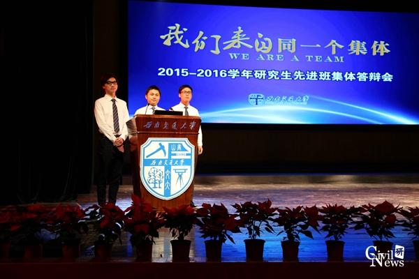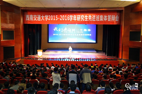 2015—2016学年研究生先进班集体答辩会于11月22日在我校九里校区大学生会堂隆重举行。此次答辩会旨在加强我校研究生班风、学风建设,增强研究生班集体的凝聚力、创造力,进一步提高研究生培养质量。通过搭建一个研究生班级相互交流和展示的平台,树立先进典型,切实发挥班级组织的育人功能。本场答辩会由学生工作处主办,机械工程学院承办。