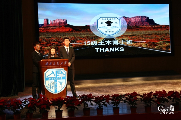 嘉宾评委提问环节中,评委老师们根据各班班级陈述、风采展示的内容,并结合各个班级的专业特色进行提问,考察答辩代表的综合知识、广域视角和临场应变能力。在对土木2015级博士班的提问中,评委老师向答辩代表询问本班同学所获专利和所发表的学术论文以及班级留学生的具体情况,答辩代表从专业知识、学术交流以及沟通方式等多方面给予了评委老师满意的解答,获得现场的阵阵掌声。