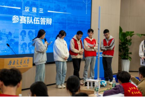 本次竞赛由作品陈述、性能测试及现场答辩三部分构成,全面考察参赛者的设计理念、实际操作能力和应变能力。竞赛开始,各队伍依照抽签顺序依次上台,各小组分别派出一名组员向评委递交设计方案,并对本组的设计理念及作品创新之处进行介绍。他们的陈述充满了自信和激情,展现了新一代设计者的风采。