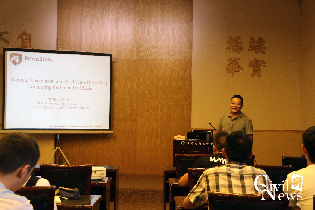 宾夕法尼亚州立大学黄海副教授关于使用SmartRock的实验室测试与压载颗粒运动的离散元建模比较的学术讲座6月27日在镜湖宾馆院士厅顺利进行。