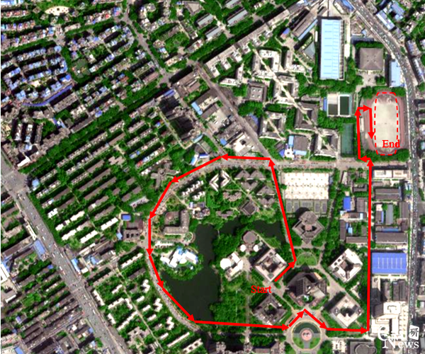 2017年10月19日16:15,由工会小组长带领入场,待统一发出起跑指令后出发,按如下示意图所示跑完一圈(约为2公里)后进入体育场结束比赛或继续比赛。(请参与者根据自身情况调整速度,可快跑可慢走,完成活动即可)。