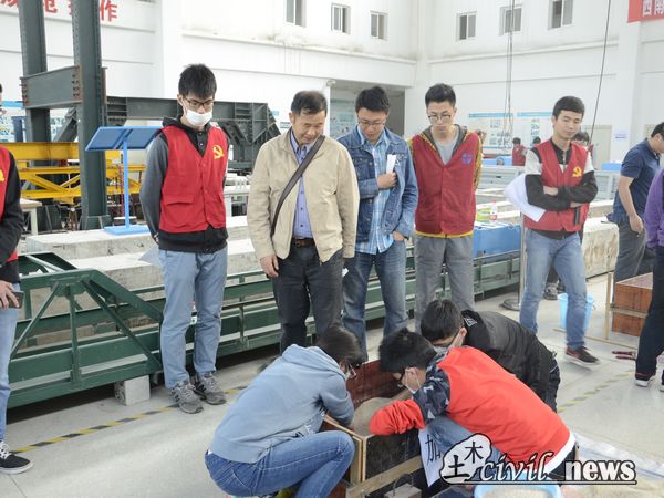 在进行决赛的过程中,每位工作人员都认真负责,尽自己最大的努力做到公平公正,专心致志地用砂砾填充每个加载箱,小心翼翼地加载每个小组的挡墙,每个动作都充分体现了作为一个工作人员应有的担当。除了工作人员,每个小组的选手们都自觉遵守竞赛规则,井然有序地排队签到、加载、答辩。