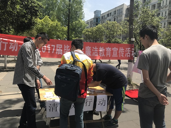 大学生学业与发展指导中心承办的有故事的青春——“清风行动”2017届毕业生廉洁教育宣传活动倡议环节在二、四食堂门口拉开序幕。本次活动旨在向全校2017届毕业生宣传“廉洁”的重要性,同时也望他们在毕业之后能够保持廉洁的品质。