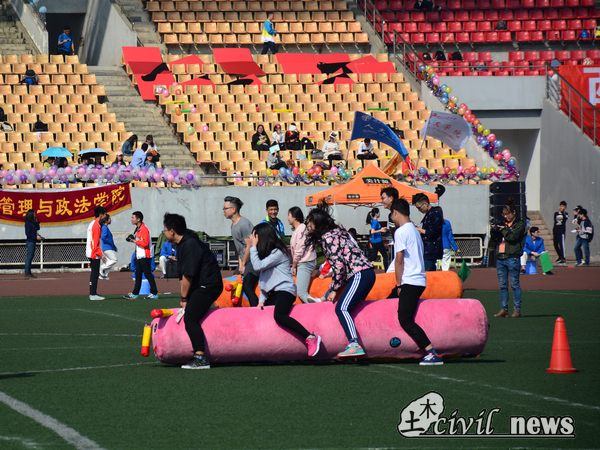趣味运动会“毛毛虫竞速”在体育场的草坪中央进行,各个学院均有四人参加。比赛在口号与欢笑声中进行得如火如荼;最终,土木学院的同学们以19秒10的成绩位列第六。同学们在收获快乐的同时也了解到了团队合作的力量。