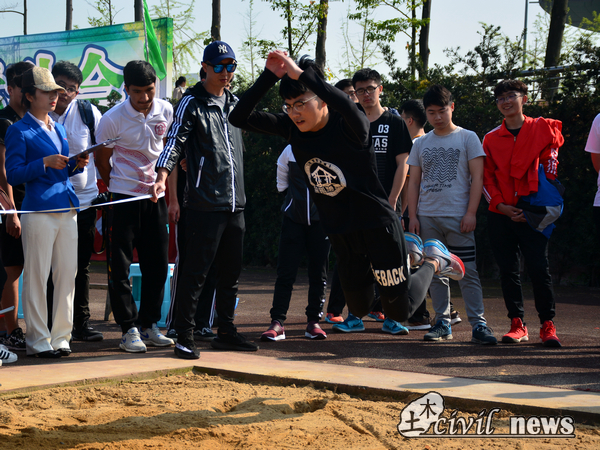 径赛进行的同时,田赛选手们也在跑道另一侧的沙坑处一较高下。在男子甲组跳远比赛中,赵宁同学多次奋力跃出,最终取得了第十名的好成绩。女子立定跳远比赛中,土木学院的李文秀、胡继丹、杜诗灵、米少瑄及陈萱颖等同学均有优异表现。