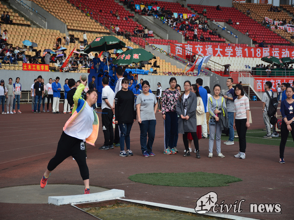 同时进行的还有女子甲组的铅球决赛。与引体向上有所不同的是,掷铅球对投掷技巧有着很高的要求。虽然实力上与其他学院的选手们有些差距,但土木院的姑娘们没有放弃,她们还是奋力地拼搏,钟茜最终凭借自己的努力取得了第八名的成绩。