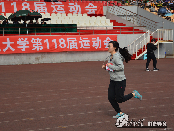 九时三十分,比赛正式开始。首先进行的是女子四百米的决赛,随着发令员的一声枪响,运动员们都向前方全力跑去。四百米是个对速度和耐力双重考验的项目,进入最后一百米后,有些选手脸上流露着痛苦的表情,但还是坚持着奔向了终点。在这个项目中,来自土木学院的女将们取得了不错的成绩。女子八百米项目中,来自一六级土木学院的胡继丹取得了第五名的好成绩,其他选手也都赛出了佳绩。她们用自己的成绩,诠释了土木人的拼搏精神和顽强不屈。