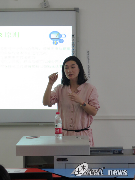 4月18日晚,由土木团建中心举办的新阶梯成才干部培训课堂“团队成员间聆听与高效沟通”正式开讲。活动分别于18点50分与20点15分两个时间段在X2530和X2536教室开讲,主讲人为车小洁老师。本次课堂“沟通从心开始”由“什么是沟通?”、“倾听的艺术”、“窥视身体语言”和“认识人际风格沟通”四部分组成。