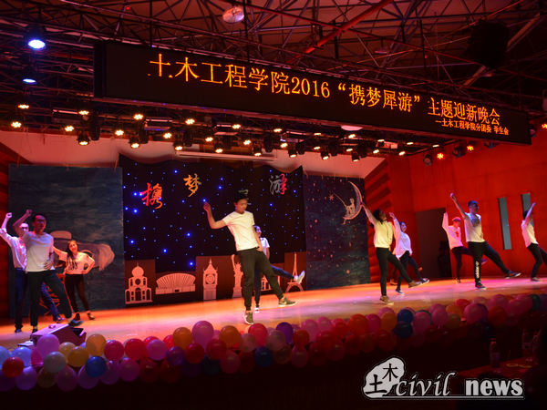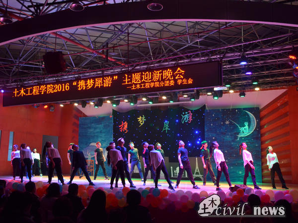 19:00既临,伴着视频的光亮,《Daddy》的音乐声,土木学生会和音乐系同学有力的动作,一支开场舞拉开了晚会的帷幕。