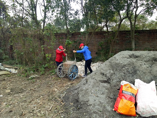 很巧的是,川农的志愿者们也来到了这里,他们已经在进行打扫了,所以我们在与管理人员交谈以后也开始了各自的工作。我们拿起了铲子,扫帚,开始打扫中心内部的道路。