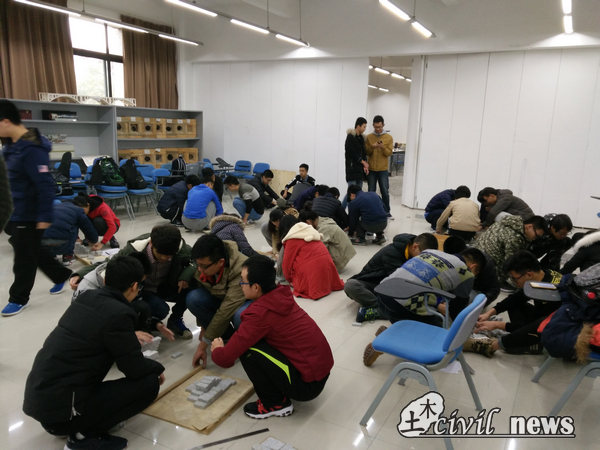 本次竞赛一共有10支参赛队伍,共40个参赛选手。下午2点,各个环节准备就绪,每个成员胸有成竹地听着赛题讲解。在熟悉比赛流程后,现场的各位都开始动手了。有的组自习分析赛题,有的组埋头搭建自己的模型,还有的组围在一起商量计算他们的“夺冠作品”,一会这一组一声尖叫,一会那一组一片爆笑,随着吵吵闹闹,模型也逐渐成形。现场一片欢乐,其乐融融。