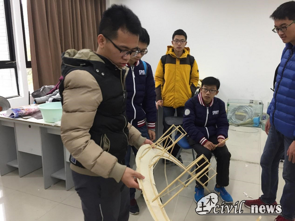 为了最大程度的给予同学们视听觉上的真实感受,交大学长们对事先制作好的模型进行了现场加载试验。在一次次饱含期待,屏气凝神中,所有的模型都结束了最后的加载。结果有失败,也有成功。失败的认真分析原因,积极做出改进。成功的,再接再厉,争取有更高的提升。结构设计大赛正是这样,在不断的尝试,努力,失败,改进中取得一个又一个的辉煌。