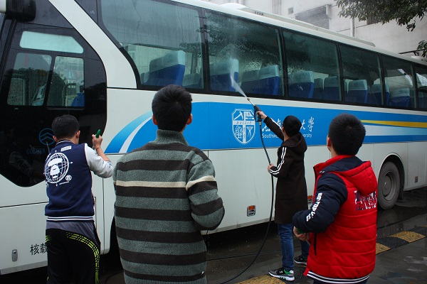 经过了一个中午的休息,下午两点,志愿者们再次在北区的校车站集合,搭乘校车前往九里校区,在九里校区的校车站开始了下午的工作。首先,为了宣传3.5“学雷锋”日,三队的志愿者制作了一张海报,在九里校车站进行了张贴,接着就开始帮司机师傅们洗起校车来,虽是这样的庞然大物,可也是先前经验让志愿者们得心应手地开始忙活起来了,大家齐心协力的洗完了几辆校车后兵分两路,一路人去往九里校园里清理垃圾,这也让这次活动增添了新意。