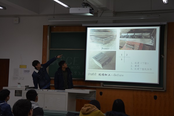 本次交流分享会可分为“赛前准备”“比赛实况”以及“经验与反思”三部分,依次由王皓正、王乾屾、胡萧越、冯乾宽、金云涛、邓江绪、廖文杰、黄道兴两两分组进行分享,全方位介绍了钢桥赛的整个流程,为将来参加钢桥比赛的同学们提出了宝贵意见。