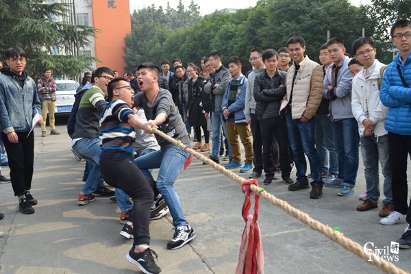 本次比赛共13支队伍参赛,比赛过程中,各班自发组成拉拉队为本班同学加油,加油声此起彼伏。随着裁判的哨声,比赛开始!各位选手压低重心、咬紧牙关,认真程度绝不亚于在学术研究上体现出的严谨精神、学者风范。比赛过程中,大家心往一处想,力往一处使,随着口号一下一下地用力,动作整齐划一。分出胜负后,取胜的队伍欢呼雀跃;失败的队伍也不气馁,队员之间相互鼓励着、切磋着,换边再战。大家虽然大汗淋漓,但是心情十分愉悦。
