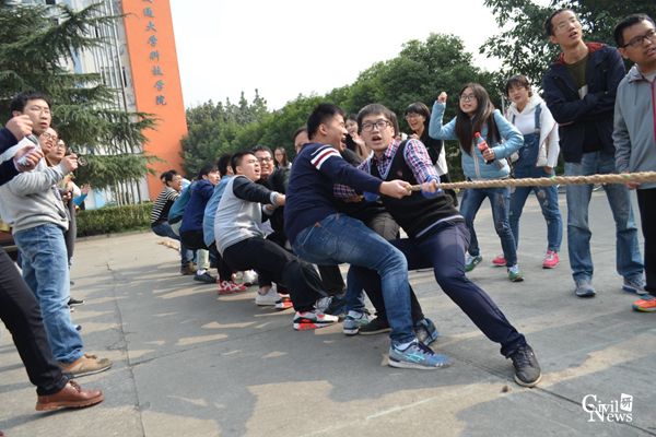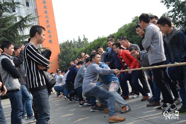 首次出战的是学硕道铁一班和学硕结构一班。比赛开始前,两支参赛队伍的队员们都半倾身体,紧紧的抓住手中的绳子,随时准备发力。裁判哨声一响,两个班级的同学便拼尽全力,努力将赛点拉向自己的班级。第一局比赛学硕道铁一班取得了胜利。第一局比赛结束后,学硕结构一班找到了自己在比赛中的不足之处,并且从新制定了比赛方案。第二局比赛开始时,两队势均力敌、不相伯仲。突然之间,学硕结构一班将赛点拉到了自己班级,学硕道铁一班不畏强敌、奋力一搏,又将赛点拉回了自己班级。经过几个回合较量后,学硕结构一班获得了第二局的胜利。第三局是决定胜负的一局,两支参赛队伍都拼尽全力,一决高低。一旁的拉拉队也开始沸腾,他们为参赛队伍呐喊助威,加油声与参赛队员的号子声合在一起,全场都沸腾了。在一番激烈地较量后,学硕结构一班最终获得了本次比赛的胜利。