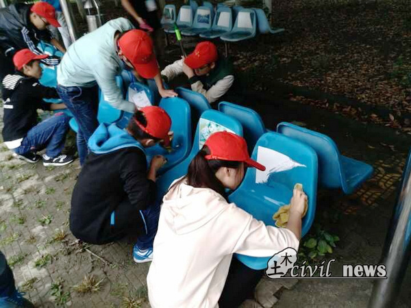 早上八点,三队人员准时集合在南区的校车站,他们头戴红色的志愿者帽,胸前挂着土木青协的工作牌,活跃在南区校车站的各个角落。手拿抹布,高举拖把,擦洗座椅,清洁栏杆,打扫垃圾。虽然有点累,但他们从未停下忙碌的双手,用汗水为学校增加一分清明。
