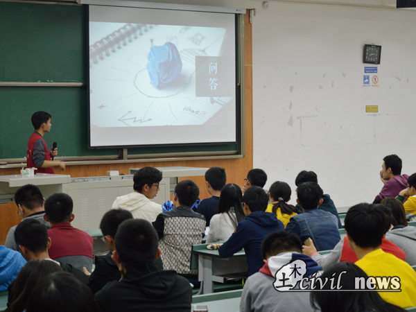 随后,在场同学通过主讲人演示的ppt了解比赛进程。比赛需要的是理论和实践的结合,参赛者不仅仅要上交模型,还要准备和该模型有关的详细电子版、纸质版理论方案书各一份。比赛形式分为初赛和决赛,进入决赛的同学还需要进行答辩并接受评审专家的提问。了解了比赛进程和评分细则过后,现场展开了问答环节。同学们积极踊跃地向主讲人提问,何思宏认真细致地为同学们答疑解惑、传授经验。