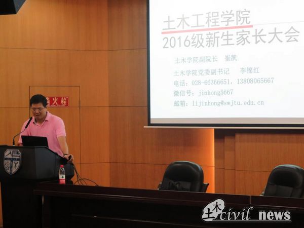 2016级新生家长大会在犀浦校区图书馆二号报告厅如期举行。土木学院李锦红副书记、崔凯副院长作为嘉宾出席了本次会议,与几百名家长共同开展了一场简单而隆重的家长会。