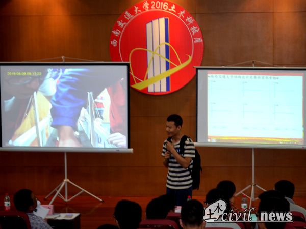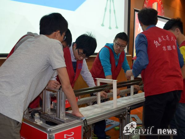 在比赛的间隙,记者有幸采访到了郑凯锋老师,他表示在这次比赛当中,踊跃出许多大一的同学,他们虽然没有学过材料力学,结构力学等专业课程,但是他们的计算公式却是合理准确的,他们的模型加载结果也十分可观,丝毫不逊色于高年级的同学,由此可见他们一定做足了功课,参考了大量的文献,令评委们感到非常欣慰!