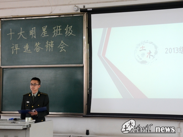 李副书记讲话完毕,来自土木学院的15个提名班级代表便开始轮流上台发言。率先上台的国防生代表张润泽同学用一面满是旌旗与奖状的荣誉墙惊艳全场。随后13级2班的代表吴桐同学更是用全院党员率第一,文明寝室率第一,奖学金率第二的数据证明了自己所在集体不容置疑的优秀。14级16班的代表郭文琦同学不仅列出本班优秀的成绩排名,还通过在合唱比赛、团日活动等文体活动中的积极表现说明了16班强大的综合实力。而来自14级15班的滕茂科同学则用一幅幅照片反映出同学们一起做趣味游戏的场景,使他们的集体更具“家庭氛围”。