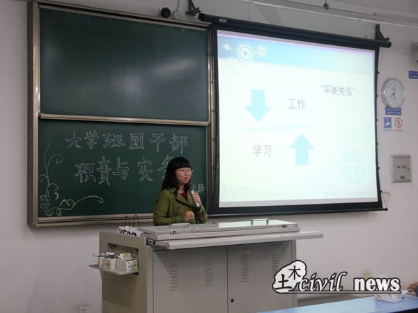 随后,熊老师开始了本次活动的第一个环节——讲解班委的具体职责。ppt里详细说明每个班委的职责,熊麟老师也对此进行补充:班长要亲民却有威严;团支书要和班长互帮互助;学委要多与老师沟通;生活委委员要财务公开……除了班委,班级中任务繁重还有寝室长,他除了要管理好寝室内的事务之外,更要记得通报通宵情况以及身体状况,以免出现意外。