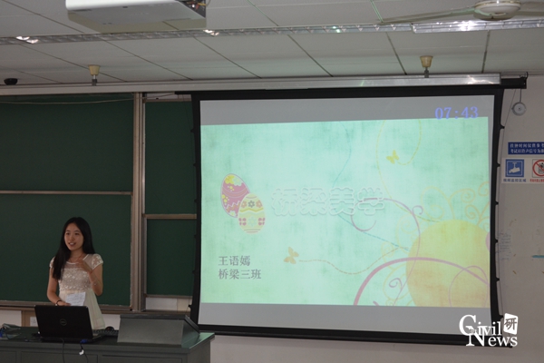 接下来,14名参赛选手依次登台演讲,选手们的演讲内容大多以自己的主修专业展开,也有部分同学另辟蹊径。首先上台的是一位桥梁专业的选手,他以“玻璃桥”为话题,借用一张张简洁、明朗、富有活力的幻灯片,在一开始就将比赛气氛带动了起来。之后,选手们的演讲愈发精彩,话题从隧道专业的隧道抗减震、围岩与隧道结构相互作用、盾构隧道掘进试验,到桥梁专业的桥梁美学、桥梁设计创新,再到铁道专业的CRTSⅡ板式无砟轨道、减振轨道结构等等,选手们都充分展示了自己的对专业知识的把握。同时还有两位选手以“思考”和“科学精神”为话题,以其发人深思的演讲引发了评委老师和观众们的思考。