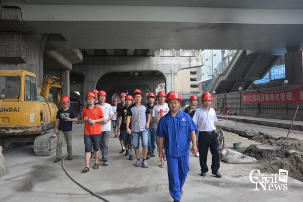 张部长首先介绍了车站的平面图和场地布置情况。他介绍到,地铁车站紧靠二环高架,并且在城市中心地带施工,场地条件受限,在工程施工中必须要做好场地的布置和安排工作。随后带领大家参观了作为车站站厅的负一层与作为车站站台的负二层。在车站负二层,还有一台已经掘通的直径大约6m的盾构机,张部长就盾构机的施工情况进行了介绍。他告诉大家,这台盾构机还将继续向火车北站方向推进。在参观过程中,同学们提出了许多问题,张部长和严主任详细地解答了各学生党员的疑问。